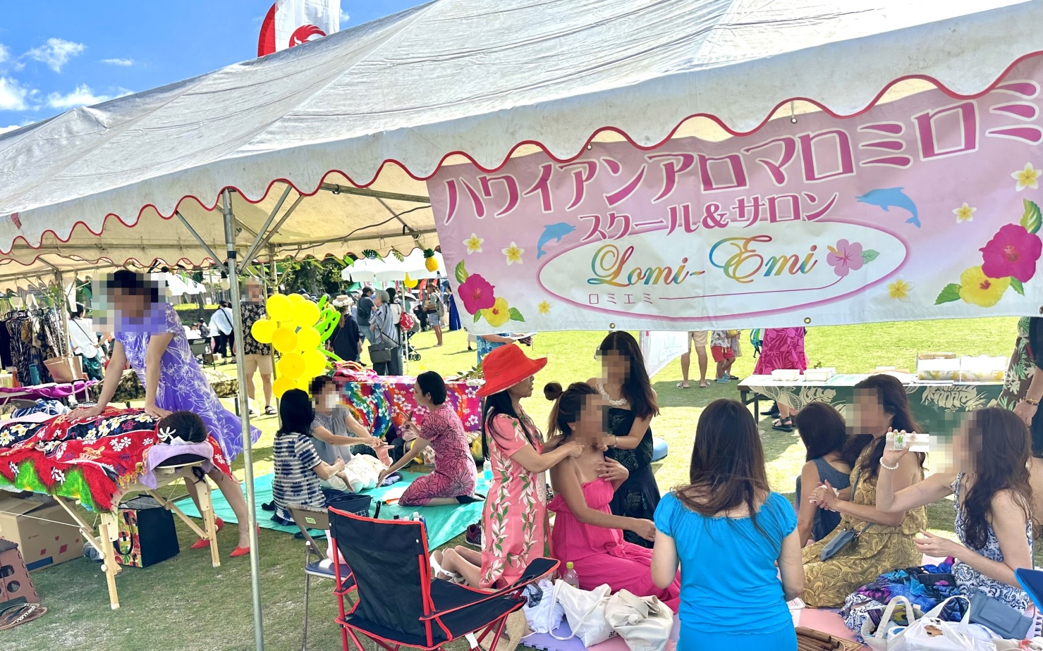 石垣島フラフェスに出店しました。 昨年と同様に、今年もセルフロミロミや「服を着たままロミロミ」大好評! |